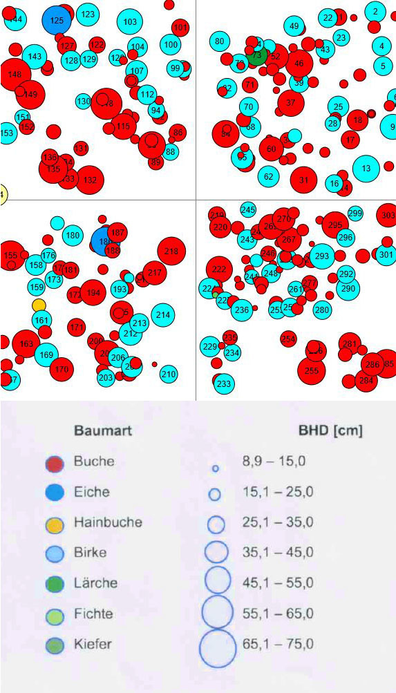 Ergänzend zu den 11 Dauerbeobachtungsflächen werden 3 Marteloskope angelegt. Marteloskope sind 1 ha große Flächen, in denen jeder Baum eingemessen und ökonomisch sowie ökologisch bewertet wird. Die Daten werden digitalisiert. So können Waldeigentümer, Förster, Studenten und andere Interessierte virtuell den Bestand auszeichnen und bekommen sofort ökonomische und ökologische Konsequenzen ihres Handels präsentiert. Marteloskope bieten somit eine ideale Übungsmöglichkeit!